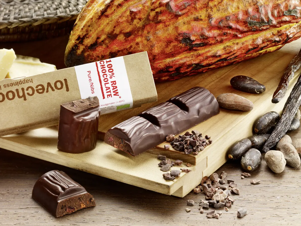 Lovechock Chocolat aux éclats de cacao en qualité crue.